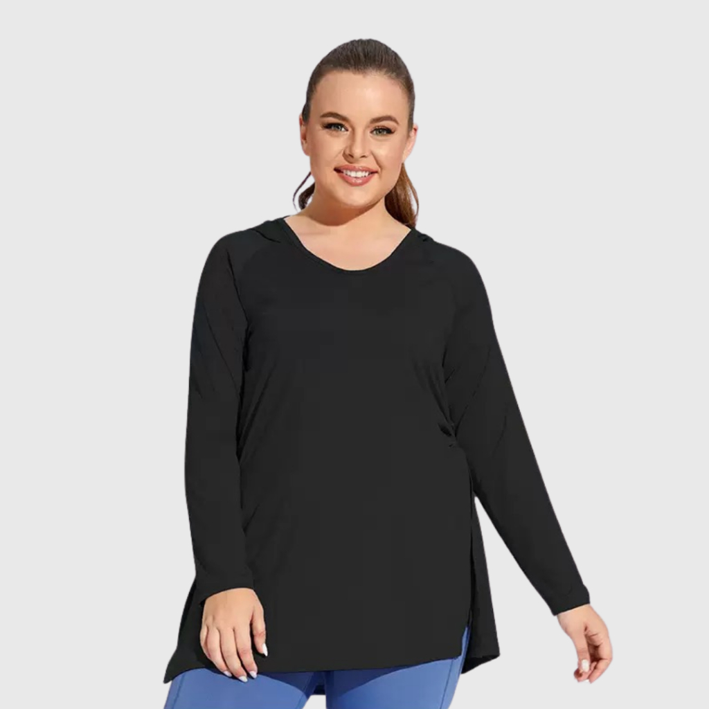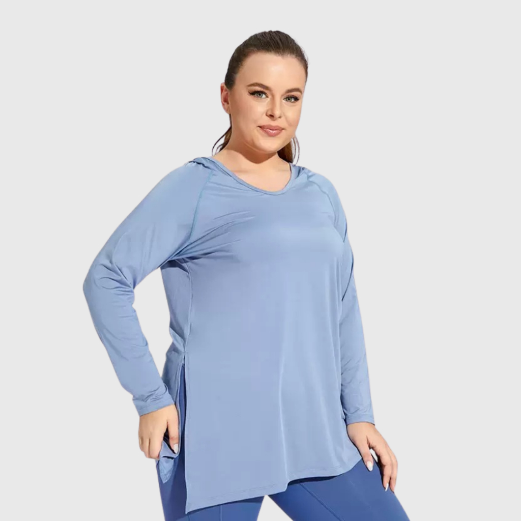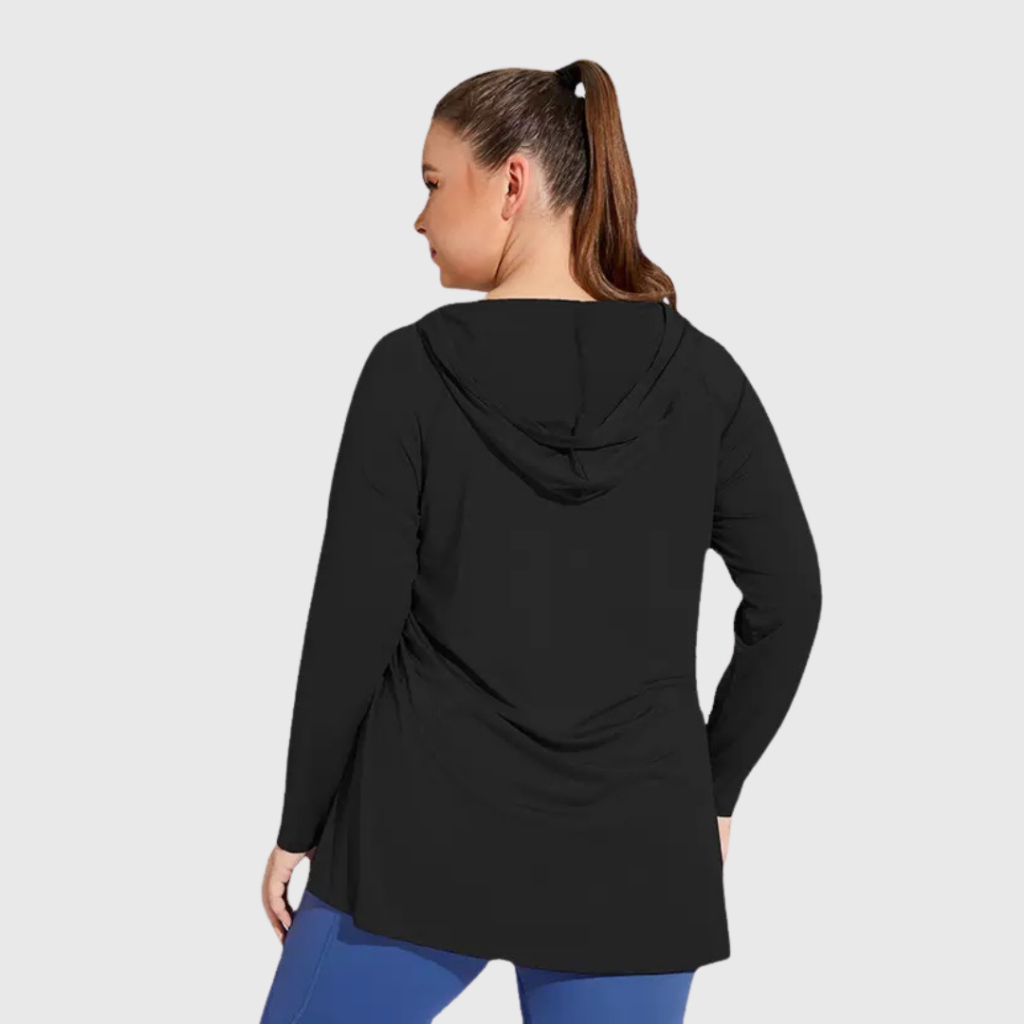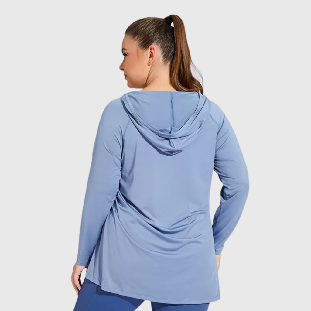 Lengan panjang bikin kamu lebih nyaman karena kulit terlindungi dari panas matahari, sementara hoodie di belakang kasih ekstra gaya sekaligus bikin lebih pede kalau olahraga di luar.